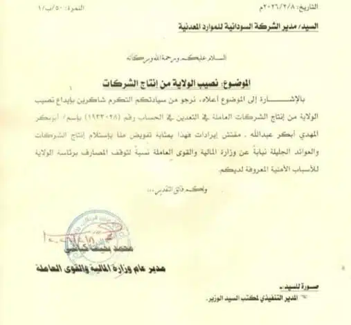 ووجّهت الوزارة، عبر مكتب المدير العام، خطاباً بتاريخ 8 فبراير 2026 إلى مدير الشركة السودانية للموارد المعدنية، تطلب فيه إيداع نصيب الولاية من إنتاج شركات التعدين في حساب يتبع لموظف يُدعى أبوبكر المهدي أبكر عبدالله.