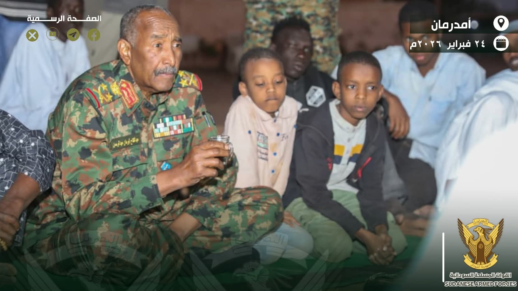 في إطار جولاته التفقدية المتواصلة لمواقع انتشار القوات المسلحة، وحرصه على الوقوف ميدانياً على الأوضاع العملياتية والمعيشية للضباط وضباط الصف والجنود، قام رئيس مجلس السيادة الانتقالي القائد العام للقوات المسلحة الفريق أول ركن عبد الفتاح البرهان بزيارة إلى قشلاق سليمان بشارة بمدينة أم درمان، حيث تناول الإفطار وسط منسوبي القوات اليوم 24 فبراير 2026م.