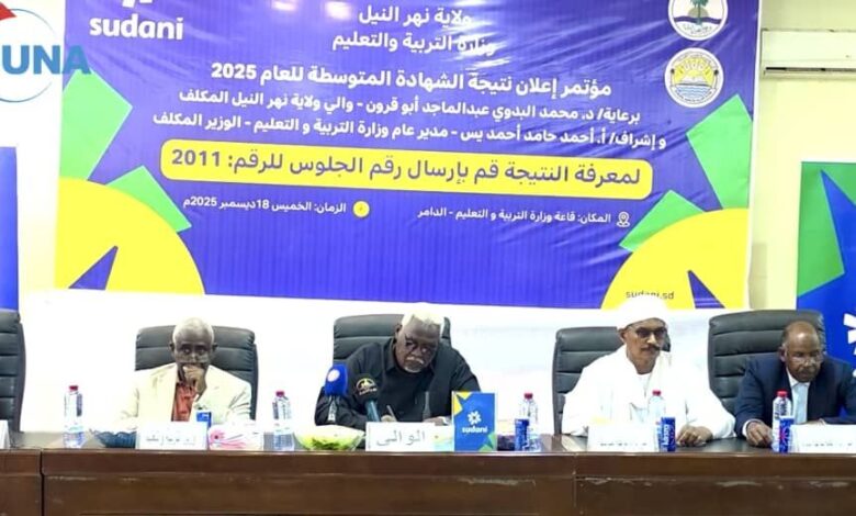 أعلنت وزارة التربية والتعليم بولاية نهر النيل، اليوم، نتيجة امتحانات الشهادة المتوسطة للعام 2025م والمراكز الخارجية، محققةً نسبة نجاح مشرفة بلغت (87.4%)، وجاء ذلك خلال مؤتمر صحفي حاشد بقاعة الوزارة بالدامر، شهده والي ولاية نهر النيل الدكتور محمد البدوي عبد الماجد أبو قرون.